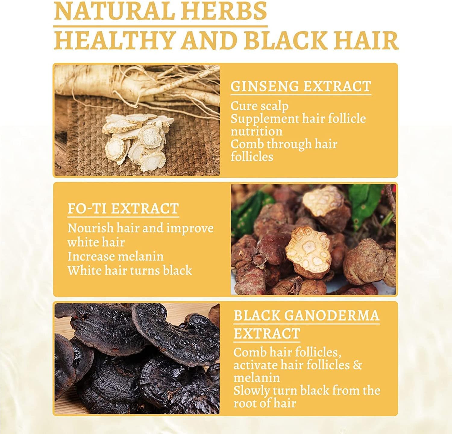 - Ganoderma Extract: Nourishes and revitalizes weak, aging hair